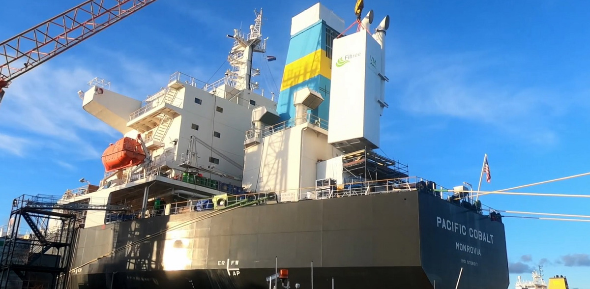 Value Maritime says that its system can filter out sulphur and particulates and capture up to 40% carbon dioxide from a ship's exhaust. The captured carbon dioxide can be stored onboard in a “battery container,” which can be used to store and transport carbon dioxide to shore.