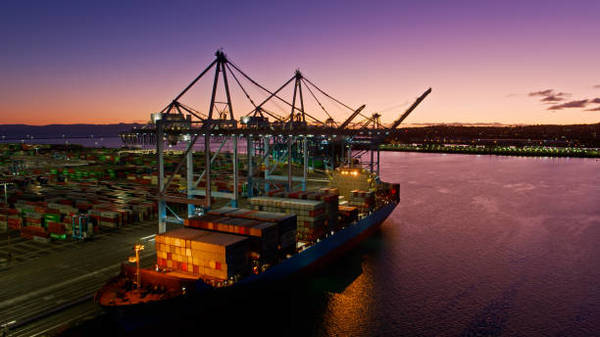 PHOTO: Aerial shot of a ship docked at the Port of Los Angeles at twilight. Getty Images